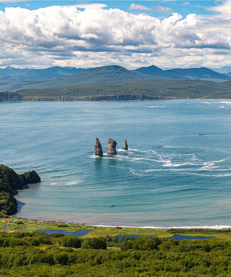 Прогулка занимает по времени весь день. Идём в сторону "Ворот" Авачинской бухты. С воды любуемся бухтами Треуголка, всеми Лагерными. Подходим к красавцам «Трём Братьям», делаем небольшую остановку для запоминающихся фотографии. Дальше выход за «ворота». По пути будет небольшой завтрак.